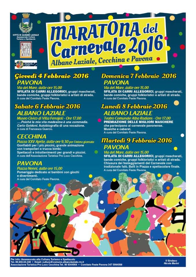 Torna l’appuntamento con il “Carnevale Pavonense”. Dopo lo straordinario successo dello scorso anno, l’edizione 2016 si annuncia ancora più entusiasmante. Gli organizzatori, il “Comitato Feste di Pavona” con il patrocinio del Comune di Albano Laziale, inizieranno i festeggiamenti “giovedì grasso”, 4 febbraio alle 15, quando da Villa Contarini proseguendo per via Del Mare partirà la sfilata dei carri allegorici e dei gruppi mascherati, con la partecipazione della banda musicale e majorette della Città di Mentana e le coreografie del gruppo percussionisti “Akuna Matata”.