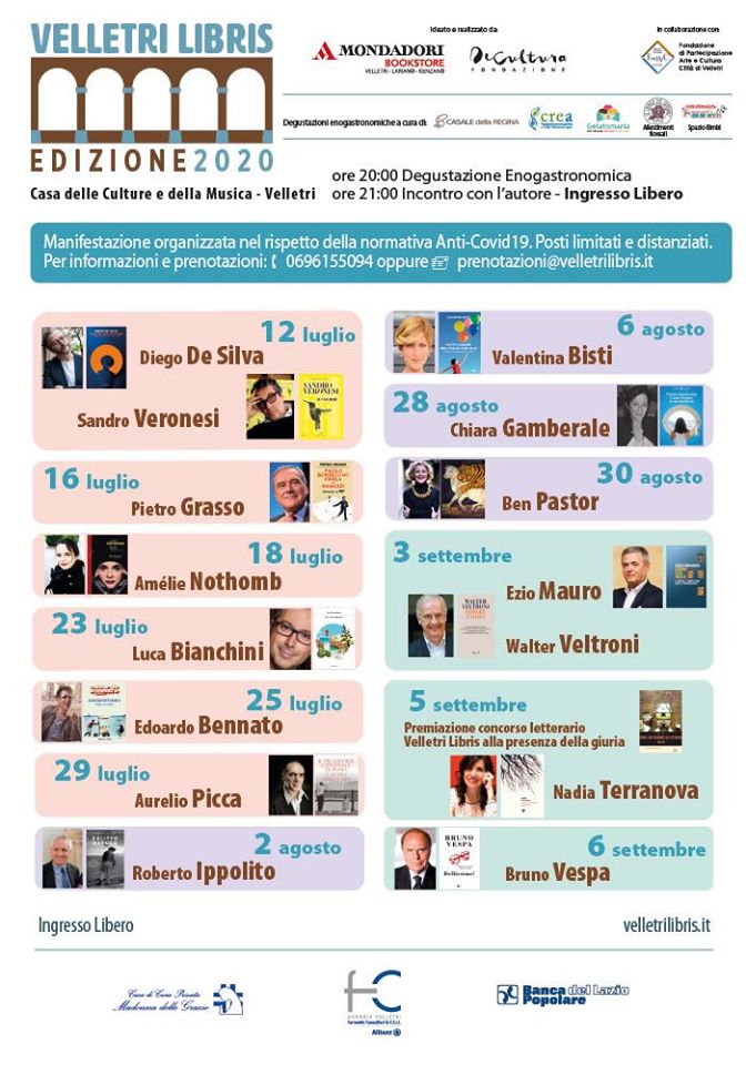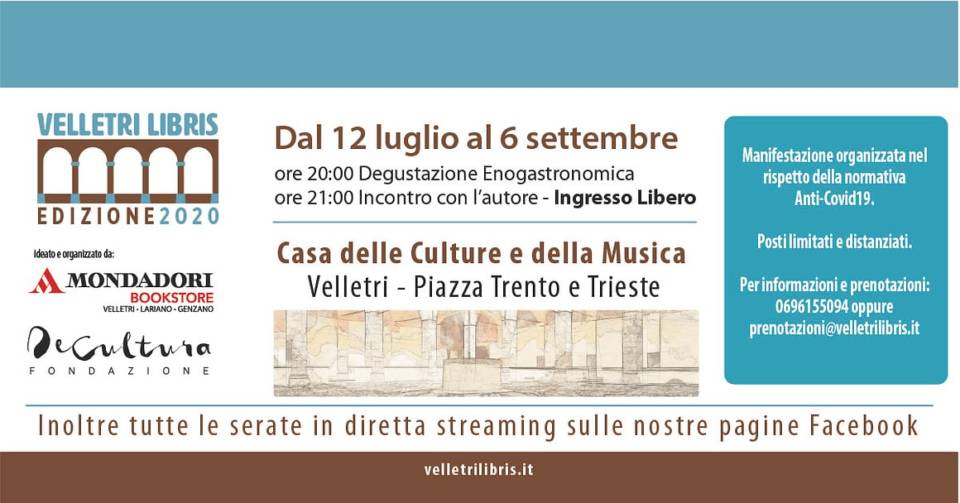 L’intera manifestazione è organizzata nel rispetto delle normative Anti Covid. Posti limitati e distanziati. Prenotazioni: 0696155094 o prenotazioni@velletrilibris.it
