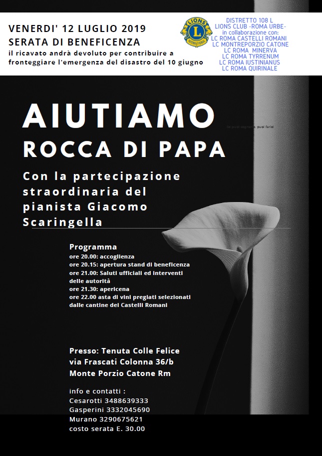 Contribuire per fronteggiare l’emergenza a Rocca di Papa dopo la tragica esplosione del Municipio del 10 giugno scorso che ha provocato la morte del sindaco Emanuele Crestini e di Vincenzo Eleuteri, uno dei suoi delegati. E’ con questa finalità che, venerdì 12 luglio prossimo, i Lions territoriali scendono in campo organizzando una serata benefica ospitata presso la Tenuta Colle Felice di via Frascati Colonna 36/b a Monte Porzio Catone. A promuoverla alcuni dei circoli parte del Distretto 108 L Italy (Lazio – Umbria – Sardegna) dell’associazione umanitaria fondata nel 1917 a Chicago da Melvin Jones, divenuta negli anni l’organizzazione di servizio più grande al mondo con i suoi oltre 46.000 club in 208 Paesi e più di 1,36 milioni di soci. L’iniziativa vede il coordinamento del Lions Club Roma Urbe, coadiuvato dalle unioni lionistiche Roma Castelli Romani, Monte Porzio Catone, Roma Minerva, Roma Tyrrhenum, Roma Iustinianus e Roma Quirinale. All’insegna del loro motto We Serve – Se puoi sognarlo puoi farlo, i Lions hanno promosso diversi momenti di solidarietà all’interno dell’evento, arricchito dalla presenza del giovane pianista Giacomo Scaringella. Con inizio alle ore 20, il programma prevede la presenza di stand benefici. Alle ore 21 il saluto ufficiale delle autorità e dei presidenti dei circoli parte dell’iniziativa. Dopo l’apericena, il cui inizio è previsto per le 21.30, verrà dato avvio a una speciale sessione di vendita all’asta di vini pregiati selezionati dalle cantine dei Castelli Romani. Il costo della serata è pari a 30€ a persona. Info: Cesarotti 348.8639333 – Gasperini 333.2045690 – Murano 329.0675621