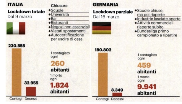 In queste settimane ci siamo dati mille risposte per spiegare la differenza tra quanto accaduto in Germania e quanto accaduto in Italia, ovviamente per continuare a teorizzare che noi siamo i migliori. Nonostante i tedeschi abbiano registrato un quarto dei nostri decessi totali, con l’incidenza di 1 morto ogni 9.941 cittadini contro il dato italico di 1 morto ogni 1.824 abitanti e abbiano avuto meno contagi di noi. Il tutto con un lock down molto più soft del nostro che ha salvaguardato la loro economia. Con le scuole che sono già ricominciate. Con il campionato di calcio che ha già celebrato un paio di giornate in totale regolarità.