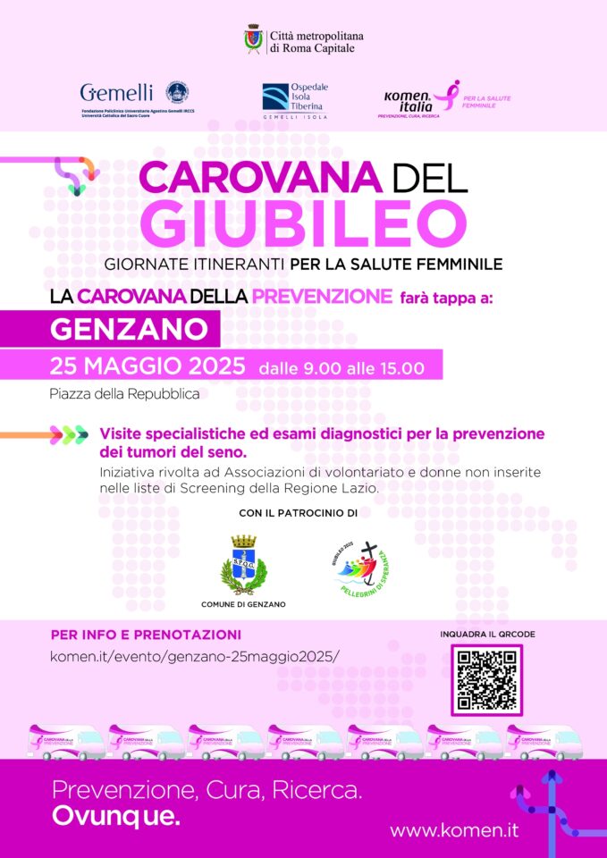 Domenica 25 maggio farà tappa a Genzano di Roma, in piazza della Repubblica, presso la farmacia comunale n°1 e il Mercato coperto, la ‘Carovana del Giubileo’ iniziativa itinerante di prevenzione per la salute femminile. Si potranno eseguire gratuitamente, previo appuntamento sul sito, indicato sulla locandina, esami diagnostici per la prevenzione dei tumori al seno: Screening ecografico tra i 18 e 39 anni. Screening mammografico tra i 40 e 49 anni e dopo i 74 anni. La Carovana del Giubileo è un progetto sociale dedicato alla tutela della salute femminile. L’iniziativa, patrocinata dal Dicastero per l’Evangelizzazione per il Giubileo 2025, nasce da una sinergia tra Komen Italia, Roma Capitale, la Città Metropolitana di Roma Capitale, l’Ospedale Isola Tiberina Gemelli Isola e la Fondazione Policlinico Universitario “A. Gemelli” IRCCS. La “Carovana del Giubileo” si inserisce nel contesto delle iniziative promosse dal Giubileo per sostenere le persone più vulnerabili, in linea con i valori di solidarietà e tutela che caratterizzano l’evento giubilare. Il programma prevede 22 “Giornate di promozione della salute femminile” durante le quali circa 3.000 donne avranno l’opportunità di accedere gratuitamente a visite specialistiche direttamente nelle loro comunità, senza alcun costo. La salute è un diritto fondamentale e l’iniziativa si prefigge di portare la prevenzione sanitaria nelle realtà più fragili con un’attenzione particolare alle donne che vivono in condizioni di disagio economico e sociale. Attraverso esami clinici e strumentali per la diagnosi precoce dei principali tumori femminili, la “Carovana del Giubileo” offre servizi sanitari essenziali, in particolare alle donne vulnerabili e pellegrine che partecipano alle iniziative giubilari. Questo progetto consente l’accesso gratuito a cure di prevenzione con l’obiettivo di colmare il divario nelle opportunità di tutela della salute. Attraverso l’azione sinergica tra Città Metropolitana di Roma Capitale e l’ Amministrazione comunale di Genzano di Roma si è riuscito a inserire tra le tappe del progetto anche la nostra città. L’ iniziativa è rivolta a donne ed associazioni di volontariato non inserite nello Screening della Regione Lazio. Per l’occasione la Farmacia Comunale resterà aperta il giorno 19 febbraio dalle 8.30 alle 19.30 con orario continuato.
