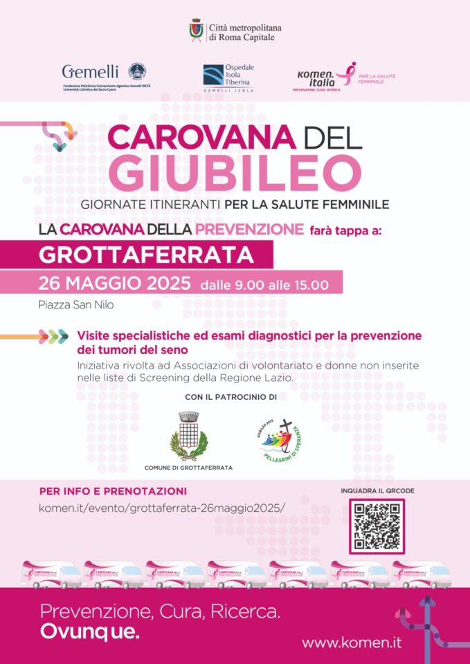 Il 26 maggio si terrà tappa a Grottaferrata la Carovana della prevenzione ideata dalla Susan G. Komen Italia, un progetto sociale dedicato alla tutela della salute femminile. L’evento, patrocinato dal Dicastero per l’Evangelizzazione per il Giubileo 2025 e dal Comune di Grottaferrata, nasce da una sinergia tra Komen Italia, Roma Capitale, la Città Metropolitana di Roma Capitale, l’Ospedale Isola Tiberina Gemelli Isola e la Fondazione Policlinico Universitario “A.