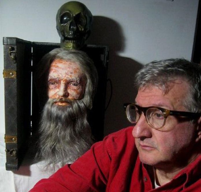 Guadagnuolo mostra il vero ritratto da vecchio di Leonardo Da Vinci. L’artista è arrivato a questo ritratto avendo percorso diverse strade di studio che sono state portate avanti, da importanti esperti con diverse interpretazioni del suo vero ritratto. Guadagnuolo lo concepisce all’interno di una valigia, custode della memoria della vita di Leonardo. Sopra la valigia, invece, il ritrovamento ipotetico del suo teschio. Poichè egli desiderava essere sepolto nella Chiesa di Saint-Florentin in Francia e così è stato, ma purtroppo la Chiesa fu demolita. La sepoltura venne dispersa negli scontri tra ugonotti (protestanti) e cattolici. Anche se nel 1874 alcuni resti trovati vennero sepolti nella Cappella del Castello di Saint-Hubert ad Amboise, però nessuno può dire che appartengono a Leonardo Da Vinci.