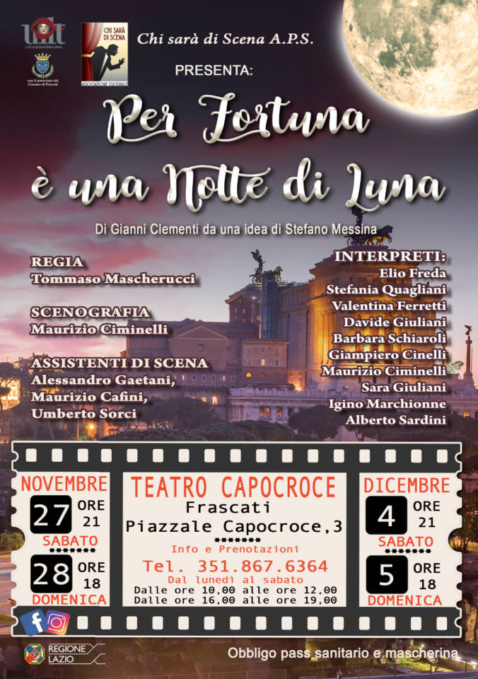 La Compagnia teatrale “Chi Sarà di Scena APS” torna a teatro con uno spettacolo dal vivo brillante ed ironico dedicato agli anni Sessanta ed oltre. Debutta al Teatro di Capocroce sabato 27 novembre 2021 alle ore 21 con la commedia “Per fortuna è una notte di luna”, di Gianni Clementi da una idea di Stefano Messina. Regia di Tommaso Mascherucci. Scenografia di Maurizio Ciminelli. Assistenti di scena: Alessandro Gaetani, Maurizio Cafini, Umberto Sorci. Le repliche sono previste per domenica 28 novembre alle 18; sabato 4 dicembre alle 21; domenica 5 dicembre alle 18. Obbligo di certificazioni verdi COVID – 19 (Green Pass) e mascherina.