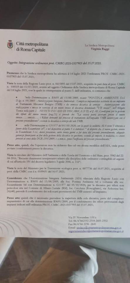 Dopo l’ordinanza della Raggi arriva a ratifica un’ordinanza del Presidente della Regione Lazio Zingaretti, firmata il 16 luglio 2016 sulla base degli accordi presi nel corso della riunione 16 luglio 2021 delle ore 12 convocata dal Prefetto di Roma.