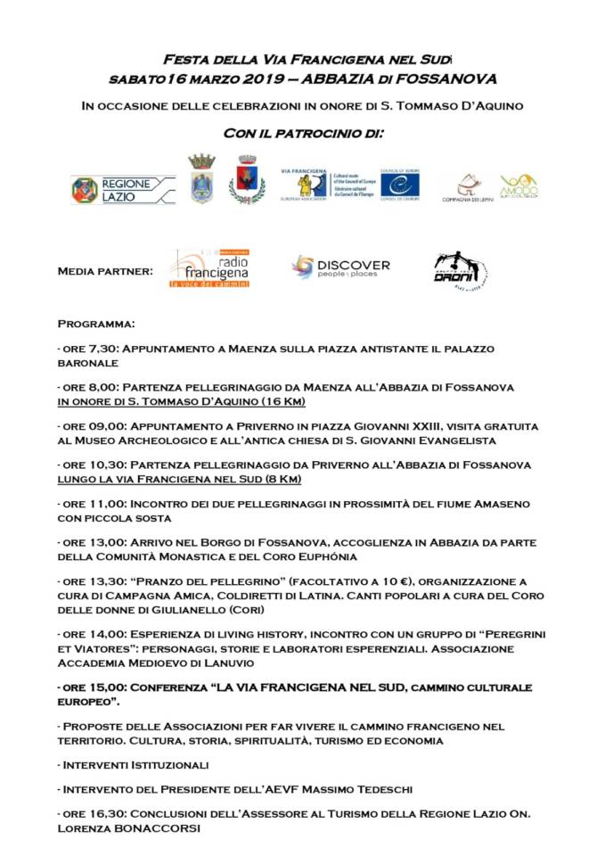 Il pellegrinaggio è organizzato in onore dei festeggiamenti di San Tommaso d’Aquino.All’Abbazia di Fossanova la conferenza avrà inizio alle ore 15:00 dal titolo La Via Francigena del Sud, cammino culturale Europeo. “La conferenza vuole sottolineare il lavoro svolto dalle associazioni e dai comuni insieme alla Regione Lazio per la certificazione del tracciato del cammino Francigeno a sud di Roma “ ci dice Giancarlo Forte presidente del Gruppo dei Dodici .