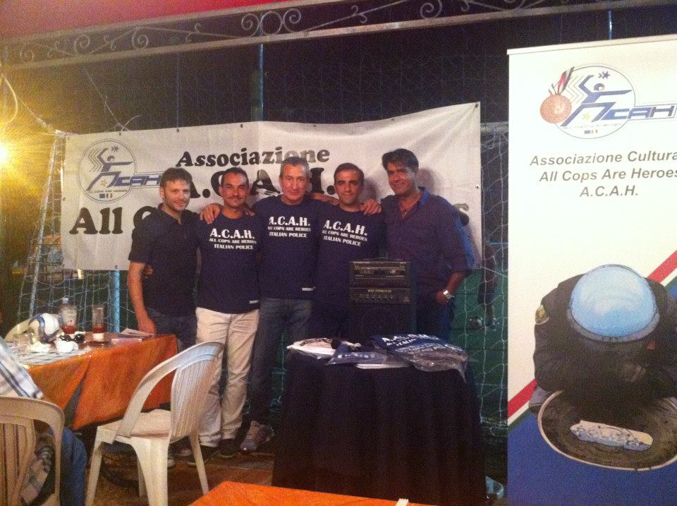 Venerdì 5 luglio presso il Circolo Bettini-Cinecittà di Roma si sono riuniti per una cena gli iscritti dell’Associazione A.C.A.H. (All Cops Are Heroes) presieduta da Francesco Paolo Russo. Malgrado le numerose adesioni tale momento conviviale ha coinvolto in minima parte le 23.000 persone iscritte all’associazione di poliziotti e delle altre forze dell’ordine nata quindici mesi fa per tutelare il buon nome di chi si occupa della sicurezza dei cittadini, organizzare iniziative sociali come il Derby del Cuore di questa primavera ed in generale per far conoscere “il nostro stile di vita, magari rigido in cui noi creiamo e che noi viviamo nel lavoro e nella vita di tutti i giorni e che vogliamo trasmettere agli altri – come ha sottolineato durante la serata il Presidente Russo”. Presenti svariati iscritti facenti parte delle forze dell’ordine, familiari tra cui tanti bambini e iscritti e non legati all’associazione, ma non agenti di pubblica sicurezza. L’incontro iniziato intorno alle ore venti a pochi passi da Cinecittà si è prolungato fino a tarda notte ed è stato l’occasione per un bilancio dell’anno lavorativo ed associazionistico, guardando anche al futuro prossimo venturo dell’associazione. A fine cena ha preso la parola proprio Francesco Paolo Russo che ha ringraziato i presenti, ha voluto sul palco Alex Bucci, Responsabile di PNW ossia Play Night World con cui l’associazione ha collaborato a partire dal Derby del Cuore del 20 maggio scorso con l’intento di propagandare i valori del “divertimento sano”. Poi assieme a Walter De Luca, autore di “Ere e Pantere”, che ha coadiuvato il Presidente in questo momento della serata, ha ricordato la possibilità di comprare il testo sul sito www.acah.it, come le magliette dell’associazione ed altri gadget per sostenere le iniziative di All Cops Are Heroes. Il testo ripercorre circa cinquantanni di Reparto Volanti voluto a metà degli anni Settanta dai vertici della Polizia di Stato ad è dedicato a coloro che sono caduti a servizio della Polizia. Infine è stata annunciata la creazione di una compagine calcistica A.C.A.H. Fortemente voluta e guidata da Marcello Ciucchi che il 28 giugno prossimo debutterà in una partita che precederà la finale mondiale di beach soccer sul lungomare di Ostia. Meta Magazine continuerà a seguire le iniziative dell’A.C.A.H. con cui comincerà una collaborazione con una rubrica del nostro sito www.metamagazine.it legata alla sicurezza e non solo. L’idea presentata dal sottoscritto e dal Presidente Russo nel corso della serata si concretizzerà nei prossimi mesi.