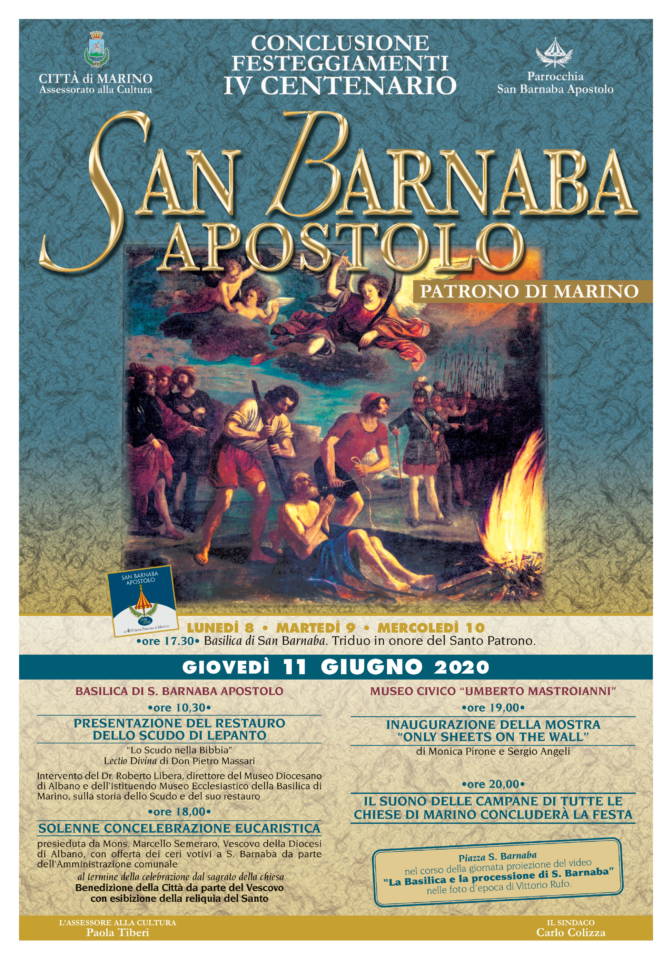 A causa delle note restrizioni dovute alla emergenza epidemiologica vissuta in prima linea anche dalla nostra città quest’anno le celebrazioni per la Festa Patronale di San Barnaba Apostolo si terranno giovedì 11 giugno 2020 in forma ridotta ed essenziale e saranno caratterizzate da due eventi culturali e da quello solenne religioso al quale si potrà partecipare nel rispetto delle norme sul distanziamento sociale e dell’igiene impartite dal Governo e che la Curia Vescovile di Albano ha fatto proprie, con particolar riferimento al numero massimo consentito di fedeli che potranno assistere. Si comincia alle 10,30 con la Presentazione del restauro dello Scudo di Lepanto presso la Basilica di San Barnaba. La lectio Divina di Mons. Massari su “Lo Scudo nella Bibbia” aprirà l’evento che proseguirà con l’intervento del dr. Roberto Libera, direttore del Museo Diocesano di Albano e dell’istituendo Museo Ecclesiastico della Basilica di Marino sulla storia dello Scudo e del suo restauro. Alle ore 18,00 la solenne Celebrazione Eucaristica presieduta da S.E. Mons. Marcello Semeraro, Vescovo della Diocesi di Albano, con l’offerta dei ceri votivi a San Barnaba da parte dell’amministrazione comunale che sarà presente nelle persone del Sindaco Carlo Colizza, del Presidente del Consiglio Comunale Santa Gabriele Narcisi e dell’Assessore alla Cultura Paola Tiberi. Al termine sul Sagrato della chiesa avrà luogo la Benedizione della Città da parte del Vescovo con l’esibizione della reliquia del Santo. Alle ore 19,00 al Museo Civico “U. Mastroianni” verrà inaugurata la Mostra “Only Shets on the wall” di Monica Pirone e Sergio Angeli, aperta e visitabile fino all’11 luglio 2020. Ulteriori informazioni sulla pagina FB del Museo Civico. Nel corso della giornata in piazza San Barnaba si potrà assistere alla proiezione del video “La Basilica di San Barnaba e la processione di S. Barnaba” nelle foto d’epoca di Vittorio Rufo. Alle ore 20,00 il suono delle campane di tutte le chiese di Marino concluderà la festa Patronale.