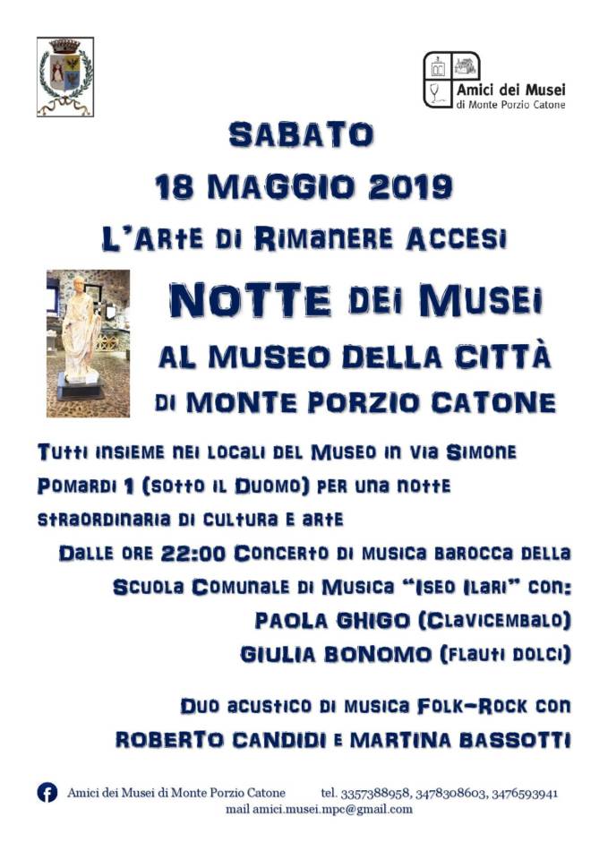Sabato 18 maggio l’Associazione “Amici dei Musei di Monte Porzio Catone” Onlus organizza la Notte Dei Musei (L’Arte di rimanere accesi) al Museo della Città di Monte Porzio Catone. L’evento si svolgerà nei locali del Museo in via Simone Pomardi 1, sotto il Duomo cittadino, per una notte straordinaria di cultura e arte. Dalle ore 22:00 si terrà un concerto di musica barocca a cura della Scuola Comunale di Musica “Iseo Ilari” con Paola Ghigo, che suonerà il clavicembalo, e Giulia Bonomo, che suonerà il flauto dolce, e, a seguire, concerto a cura del Duo acustico di musica Folk-Rock con Roberto Candidi e Martina Bassotti.