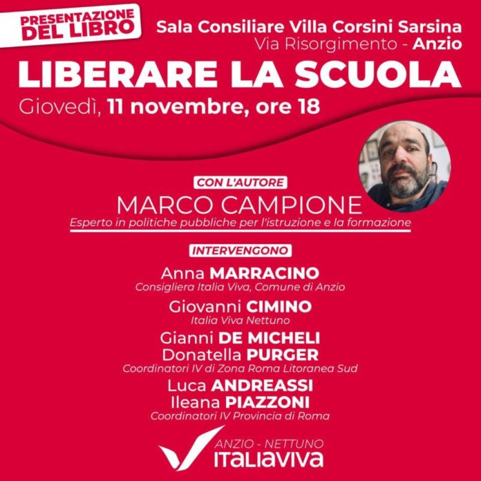 A presentare il suo libro, oltre uno dei due curatori, Marco Campione ( 50 anni, nato a Pisa, una vita tra Milano e Roma, un passato professionale tra la l’alta formazione aziendale per la pubblica amministrazione e un ruolo di caposegreteria tecnica con sottosegretari e Ministri dell’Istruzione tra il 2014 e il 2018 e ora il ruolo di coordinatore per la scuola nella Segreteria Nazionale di “Italia Viva) la consigliera comunale di “Italia Viva” ad Anzio, Anna Marracino, Giovanni Cimino, già docente nelle scuole superiori e attualmente membro di Italia Viva Nettuno, nonché i coordinatori del Litorale Sud di Roma del partito di Renzi, GiannI De Micheli e Donatella Purger.