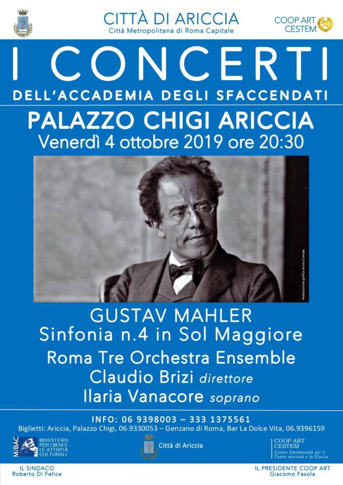 “I Concerti dell’Accademia degli Sfaccendati”, organizzati dalla COOP ART di Roma, presentano una versione cameristica della Sinfonia n.4 in sol maggiore di Gustav Mahler, con un organico di undici strumentisti e l’intervento del soprano nell’ultimo movimento, che verrà eseguita prima al Palazzo Chigi di Ariccia, venerdì 4 ottobre alle ore 20:30, successivamente a Roma al Teatro di Villa Torlonia, sabato 5 ottobre alle ore 20, e infine al Teatro Boni di Acquapendente domenica 6 ottobre alle ore 17:30. Ne saranno interpreti gli strumentisti dell’Ensemble di Roma Tre Orchestra diretti all’Harmonium dal M° Claudio Brizi con la partecipazione del soprano Ilaria Vanacore. Da segnalare che l’Harmonium e il Pianoforte previsti nell’organico saranno due rarissimi e pregevolissimi strumenti d’epoca, rispettivamente del 1870 (Vienna) e del 1903 (Lipsia), di proprietà del M° Brizi. La Quarta Sinfonia, nata da un progetto iniziale di ben 6 movimenti, si articola nei classici 4 movimenti di cui l’ultimo è un Lied intitolato Das Himmlische Leben (La vita celestiale) tratto dalla raccolta Des Knaben Wunderhorn di Arnim e Brentano. La Sinfonia è una bellissima riflessione sulla forma sonata e sul genere sinfonia nella luce declinante del suo tramonto che nel Lied conclusivo ci parla di uno strano Paradiso all’alba del “nuovo” secolo a Vienna. “I Concerti dell’Accademia degli Sfaccendati” al Palazzo Chigi di Ariccia sono realizzati dalla COOP ART con il patrocinio e il contributo del Comune di Ariccia e del Ministero per i Beni e le Attività Culturali (MiBAC). Per informazioni telefonare alla segreteria dei Concerti dell’Accademia degli Sfaccendati: 069398003 / 3331375561 oppure scrivere a info@concertiaccademiasfaccendati.it