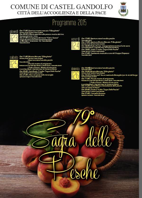A Castel Gandolfo fervono i preparativi per la 79° edizione della Sagra delle Pesche. Anche quest’anno, dal 23 al 26 luglio l’Amministrazione Comunale organizza nello splendido borgo di Castel Gandolfo i festeggiamenti della famosa Sagra Castellana. Castel Gandolfo, selezionato tra “I borghi più belli d’Italia” si trasformerà per quattro giorni consecutivi in un grande teatro all’aperto capace di ospitare molteplici eventi culturali; un weekend per vivere il territorio degustando uno dei frutti più buoni e amati della stagione estiva.La Sagra, appuntamento amato e sentito da tutti i Castellani, offrirà ai visitatori un prodotto d’eccellenza: le dolcissime pesche locali, frutto coltivato da secoli in grande quantità in queste fertili zone del bacino del Lago Albano. Il programma, promosso dall’Assessorato alla Cultura rievoca la Tradizione popolare oltre alla Promozione del territorio, comprende il coinvolgimento artisti ed associazioni locali al fine di valorizzare la “castellanità”. Esposizioni di artisti locali coloreranno la splendida cornice del centro storico; compagnie musicali e associazioni culturali si alterneranno sulla bellissima piazza centrale con spettacoli, musical, concerti e tanto altro ancora. Anche lo sport sarà rappresentato dalle gare di Canoa, che si svolgeranno sulle acque del meraviglioso lago accompagnate dal 3° trofeo di calcetto “Sagra delle pesche” per il quale i diversi rioni castellani si sfideranno. La fanfara dei bersaglieri ci farà emozionare eseguendo brani musicali per le vie del borgo.Non mancherà la celebrazione Eucaristica con tradizionale benedizione delle pesche.Questo e tanto altro ancora per festeggiare insieme la storica Sagra Castellana.