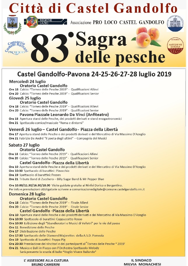 Come da tradizione anche quest’anno nell’ultimo fine settimana di luglio a Castel Gandolfo si terrà la storica Sagra delle Pesche. Un evento arrivato alla sua 83esima edizione che verrà celebrato con 5 giorni di festa, dal 24 al 28 luglio, con giochi, spettacoli, musica ed enogastronomia tra il Borgo e Pavona di Castel Gandolfo. A dare il via ai festeggiamenti sarà il “Torneo delle Pesche 2019” che da mercoledì 24 luglio vedrà impegnate sul campo dell’Oratorio di Castel Gandolfo le squadre del girone degli Allievi e quelle dei Senior. Un doppio appuntamento, alle ore 18 e alle ore 20, che ci accompagnerà tutti i giorni fino alla finale di domenica 28 luglio. Giovedì 25 luglio la Sagra delle Pesche arriva a Pavona, nell’Anfiteatro di piazzale Leonardo Da Vinci, con l’apertura degli stand enogastronomici e dello stand delle Pesche, dove dalle 18 si potranno degustare alcune ricette e specialità realizzate con l’ingrediente principe della sagra. La serata continuerà alle ore 21 con lo spettacolo comico e musicale “Roma e dintorni”. Lo stand delle Pesche venerdì 26 luglio si sposterà in piazza della Libertà a Castel Gandolfo. Qui dalle ore 17 si potranno degustare i prodotti realizzati con le pesche e si potranno fare acquisti nel Mercatino allestito lungo via Massimo D’Azeglio. Alle ore 21 sul palco in piazza della Libertà andrà in scena lo spettacolo “Fabrizio De André. Il poeta degli ultimi” a cura della Compagnia dei Musici. Sabato 27 luglio i festeggiamenti inizieranno dalle ore 10. In piazza della Libertà si aprirà lo stand delle Pesche e dei prodotti derivati e mentre via Massimo D’azeglio si animerà con i banchi del Mercatino. Spazio anche ai più piccoli con due spettacoli di burattini a loro dedicati in piazza della Libertà: alle ore 10:30 andrà in scena la favola di Pinocchio e alle ore 19 sarà la volta del regno di ghiaccio di Frozen. In occasione della Sagra delle Pesche torneranno anche le visite guidate gratuite a due tesori storico-archeologici del Lago Albano: il Ninfeo Dorico e il Ninfeo Bergantino. Le visite guidate, organizzate grazie alla collaborazione con la Soprintendenza, saranno quattro e si terranno alle 10.00, 11.30, 16.30 e 18.00. Per partecipare bisognerà registrarsi mandando una mail all’indirizzo comunicazionedigitale@comune.castelgandolfo.rm.it. Alle ore 21 salirà sul palco la Billy Sugar Band & Mr Pepper Blue, tribute Band di Zucchero. Domenica 28 luglio, oltre alle finali del Torneo delle Pesche 2019 che si disputeranno nel pomeriggio fino a sera all’Oratorio, dalle ore 10 in piazza della Libertà si potranno degustare le pesche allo stand dedicato oppure passeggiare tra i banchi del Mercatino in via Massimo D’Azeglio. Anche domenica si terranno due spettacoli di burattini: alle ore 10:30 andrà in scena la storia di Cappuccetto Rosso e alle 19 le avventure di Peppa Pig. Alle ore 10:30 per le vie del paese si terrà l’esibizione degli “Sbandieratori e Musici di Velletri” e alle ore 11 ci sarà la tradizionale benedizione delle Pesche. I festeggiamenti poi riprenderanno nel pomeriggio di domenica, quando alle 17 ci sarà la consueta distribuzione delle Pesche in piazza della Libertà. A seguire, alle ore 17:30 si esibiranno le “Diamond Majorettes” della A.S.D. Pomezia. La sera, alle ore 20:30, saranno premiati sul palco i vincitori e i partecipanti al “Torneo delle Pesche 2019” e alle ore 21 si ballerà in piazza con l’Orchestra Spettacolo Melody e la scuola di ballo “Voglio Vivere Ballando”. Omaggio alla musica di De Andrè a Castel Gandolfo.