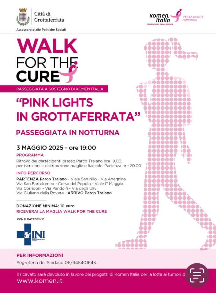 A Grottaferrata la seconda edizione della «Walk for the Cure» si tinge di rosa con la fiaccolata notturna che l’Amministrazione Di Bernardo, Assessorato alle Politiche sociali, ha organizzato per sabato 3 maggio 2025. La manifestazione, il cui sottotitolo quest’anno è «Pink Lights in Grottaferrata», è realizzata in collaborazione e con il patrocinio dell’Associazione Susan G. Komen Italia per finanziare la ricerca contro il cancro femminile al seno e promuovere stili di vita in grado di prevenire l’insorgere della malattia.