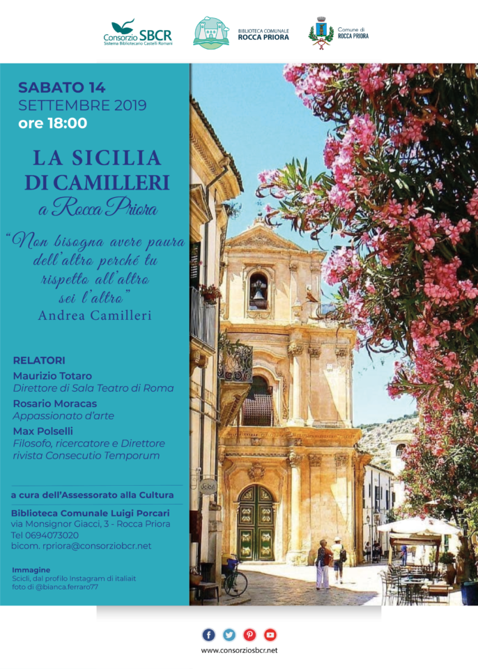 Sabato 14 settembre alle ore 18 “La Sicilia di Camilleri” arriva a Rocca Priora con un pomeriggio dedicato allo scrittore, sceneggiatore, regista, drammaturgo e insegnante Andrea Camilleri. Un viaggio attraverso i suoi luoghi e i le sue parole, partendo dalla sua riflessione: “Non bisogna avere paura dell’altro perché tu rispetto all’altro sei l’altro”. Interverranno Maurizio Totaro direttore di Sala Teatro di Roma, Rosario Moracas appassionato d’arte e Max Polselli filosofo, ricercatore e Direttore rivista Consecutio Temporum. L’evento, curato dall’Assessorato alla Cultura in collaborazione con la Biblioteca di Rocca Priora e il Sistema Bibliotecario dei Castelli Romani, si terrà alla Biblioteca Comunale Luigi Porcari in via Monsignor Giacci, 3.