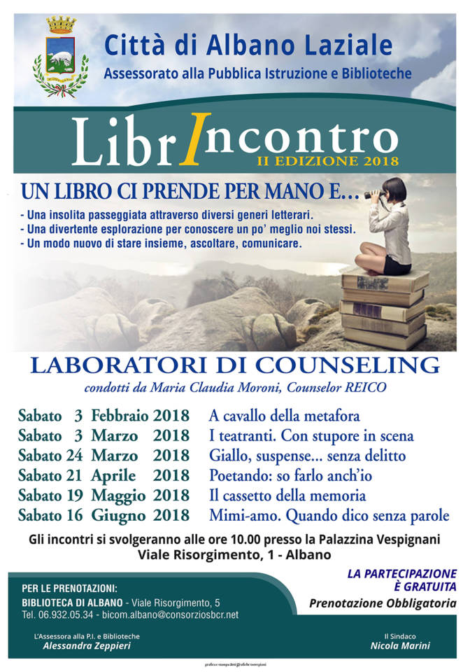 La Biblioteca Comunale di Albano Laziale “Cesare De Sanctis” organizza a partire da sabato 3 febbraio alle ore 10:00 presso la Palazzina Vespignani di Viale Risorgimento, 1 i laboratori di Counseling dal titolo “LibrIncontro: un libro ci prende per mano e…” a cura della Counselor Reico Maria Claudia Moroni.