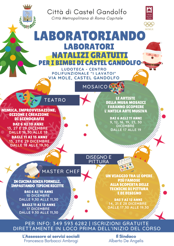 Mosaico, disegno, pittura, cucina e teatro. Dal 9 al 30 dicembre arriva “Laboratoriando”, un dono speciale da mettere sotto l’albero pensato per le bambine e i bambine di Castel Gandolfo: quattro laboratori totalmente gratuiti organizzati dal Comune di Castel Gandolfo in collaborazione con la Cooperativa Sociale Onlus Archimede.