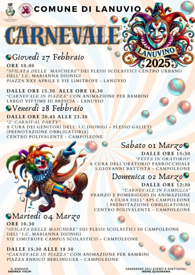 Da giovedì 27 febbraio a martedì 4 marzo Lanuvio si riempirà di maschere e coriandoli per festeggiare il carnevale nelle piazze.
