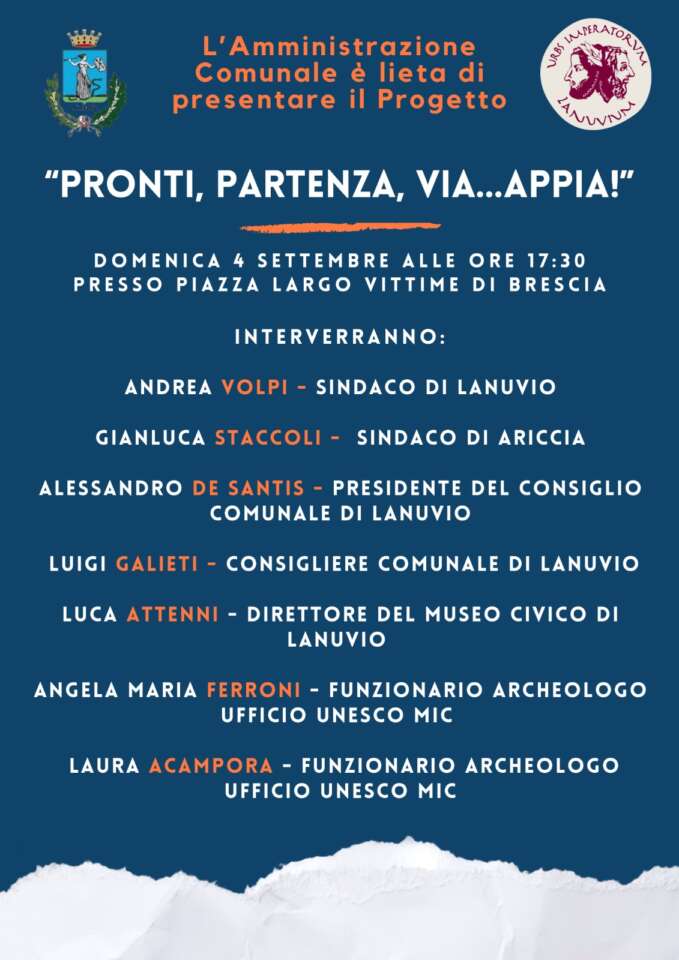 Verrà presentato domenica 4 settembre a Lanuvio il progetto “Pronti, Partenza, Via… Appia” realizzato dal comune di Lanuvio con la collaborazione del Ministero della Cultura. Il progetto nasce per agevolare l’inserimento della via Appia nella lista dei siti patrimonio dell’UNESCO.