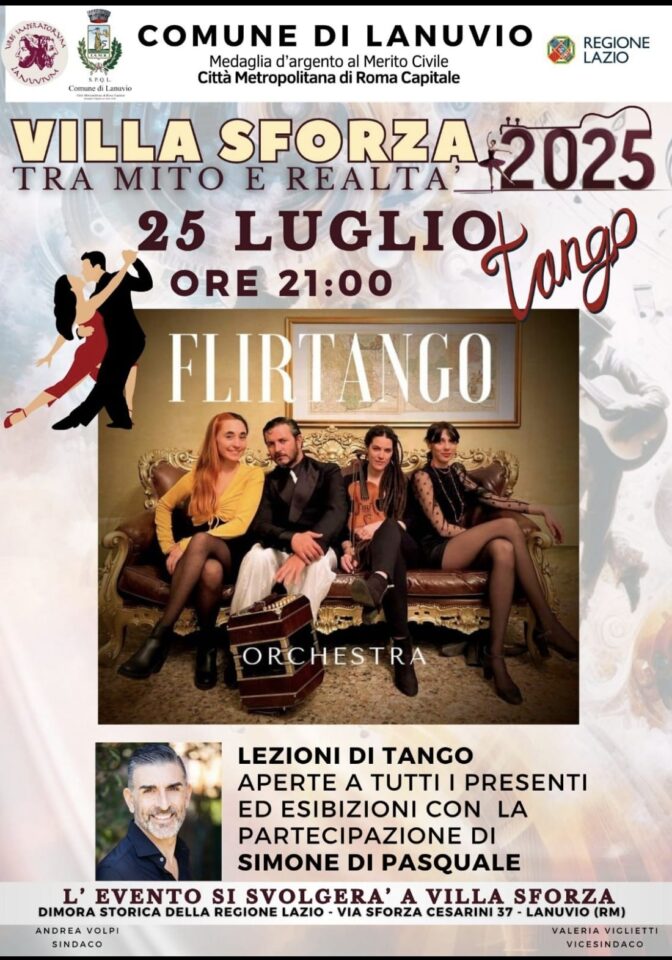 Nell’ambito del progetto “Villa Sforza tra Mito e Realtà” e de Le Notti del Vino 2025 di Lanuvio, il Comune propone due appuntamenti consecutivi ad ingresso libero, all’insegna della cultura, della danza e della musica.