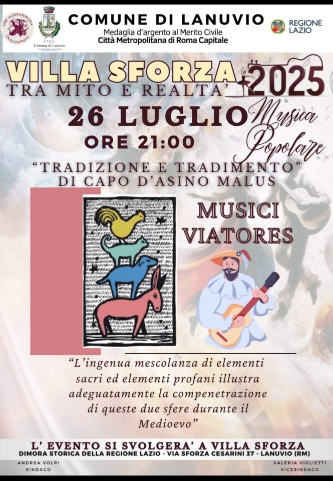 Sabato 26 luglio, sempre alle 21.00, spazio alla musica popolare con lo spettacolo “Tradizione e Tradimento” dei Musici Viatores, gruppo specializzato nel recupero e nell’esecuzione di repertori medievali e rinascimentali. La performance, attraverso strumenti antichi e racconti in musica, proporrà un viaggio nelle sonorità e nei simboli del passato, intrecciando elementi sacri e profani in un’atmosfera suggestiva e coinvolgente.