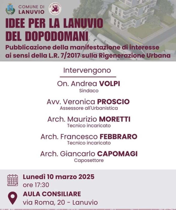 Lunedì 10 marzo 2025 alle ore 17.30 presso l’Aula Consiliare del Comune di Lanuvio si svolgerà un incontro per approfondire il tema della Rigenerazione Urbana che l’Amministrazione sta attuando sul territorio in parallelo alla variante Generale al Piano Regolatore. Infatti, attraverso lo strumento di cui alla L.R. 7/2017 è possibile intervenire in più parti del paese che necessitano di essere recuperate e/o rigenerate, con tempi più brevi rispetto agli ordinari strumenti di pianificazione urbanistica.