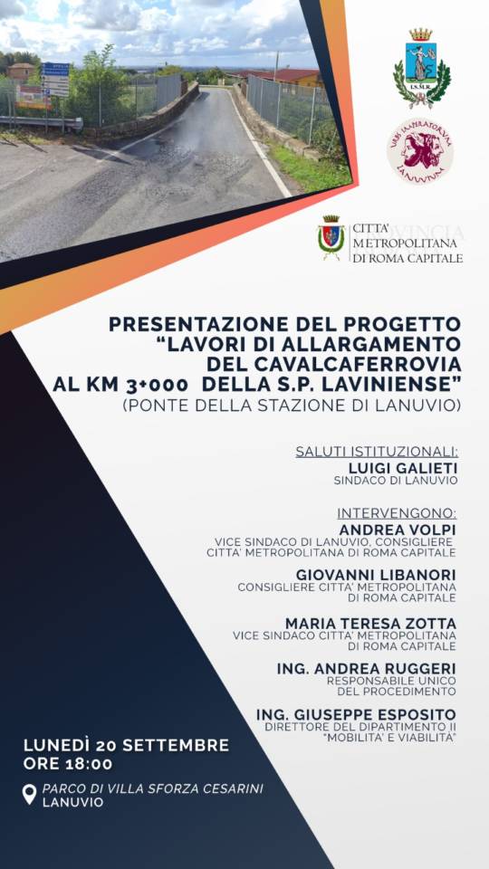 Lo scorso giugno Andrea Volpi, vicesindaco del Comune di Lanuvio e consigliere della Città Metropolitana, ha annunciato lo stanziamento di 685 mila euro per i lavori di ampliamento del ponte della stazione di Lanuvio. Durante l’estate il progetto di riqualificazione urbana è stato completato e sarà presentato alla cittadinanza lunedì 20 settembre alle ore 18:00 presso il Parco di Villa Sforza.