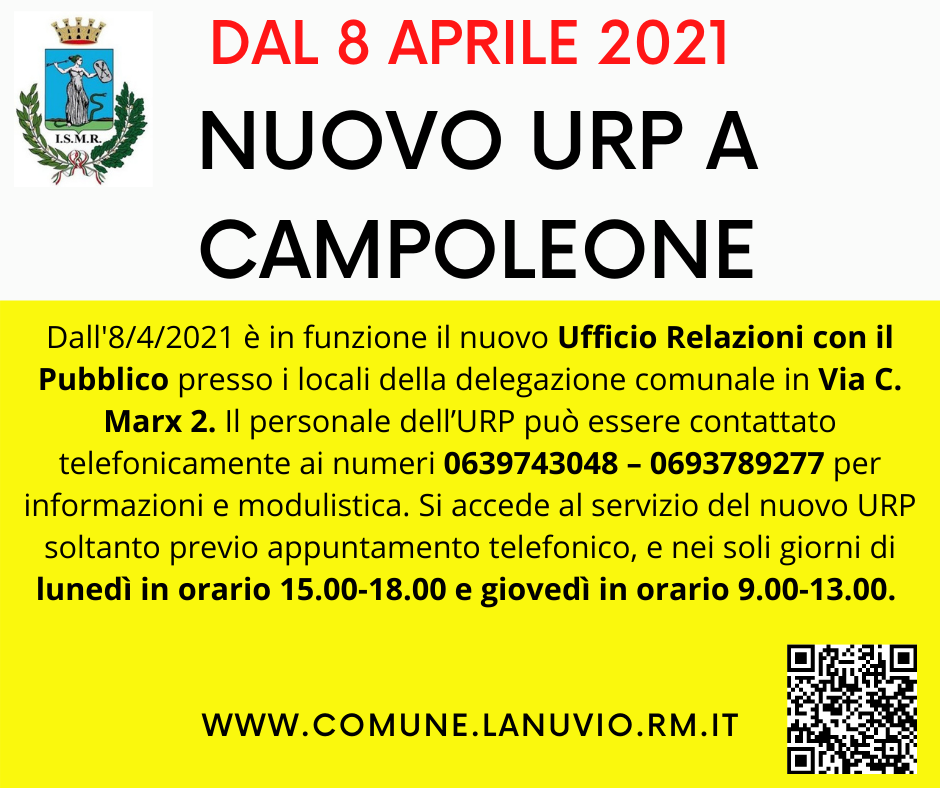 “L’URP-Ufficio Relazioni con il Pubblico del Comune di Lanuvio ha cambiato sede. Il servizio (prima collocato nella sede del Palazzo Municipale in Via Roma, 20) è stato trasferito al piano terra dell’edificio M.A. Colonna situato in Via Sforza Cesarini,24. E’ inoltre attiva da qualche settimana la sede decentrata a Campoleone (Viale Carlo Marx,2).
