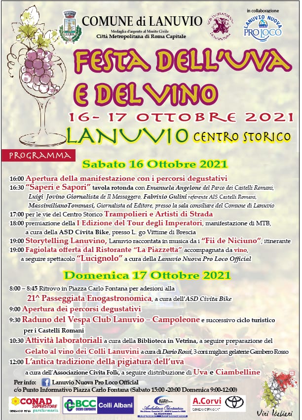 La Festa partirà sabato 16 ottobre con la tavola rotonda “Saperi e Sapori” alle 16:30 nella Sala Consiliare del Comune di Lanuvio per proseguire poi nel centro storico con gli artisti di strada e lo spettacolo musicale itinerante dei “Fii de Niciuno”, “Storytelling Lanuvino”. Nella mattinata di domenica 17, invece, sarà la volta della passeggiata gastronomica organizzata dall’ASD Civita Bike e dei laboratori per la preparazione del gelato. La due giorni si concluderà con l’antica tradizione della pigiatura dell’uva a cura dell’Associazione Civita Folk. Per informazioni è possibile rivolgersi, su facebook, alla Lanuvio Nuova Pro Loco oppure c/o Punto Informativo Piazza Carlo Fontana (Sabato 15:00 -20:00 Domenica 9:00-12:00).