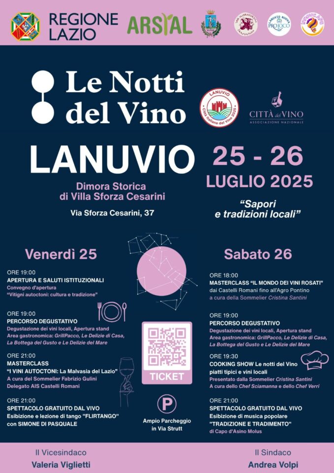 «Siamo orgogliosi – afferma il Sindaco di Lanuvio, Andrea Volpi – di ospitare un evento che racconta il nostro territorio attraverso le sue eccellenze. Le Notti del Vino sono un’occasione per far conoscere la qualità dei nostri produttori, valorizzare Villa Sforza Cesarini e offrire ai visitatori un’esperienza autentica, che unisce tradizione, cultura e convivialità. Un ringraziamento speciale va anche a Innova Aps, la giovane associazione lanuvina che, con entusiasmo e passione, sta contribuendo attivamente all’organizzazione della manifestazione.»