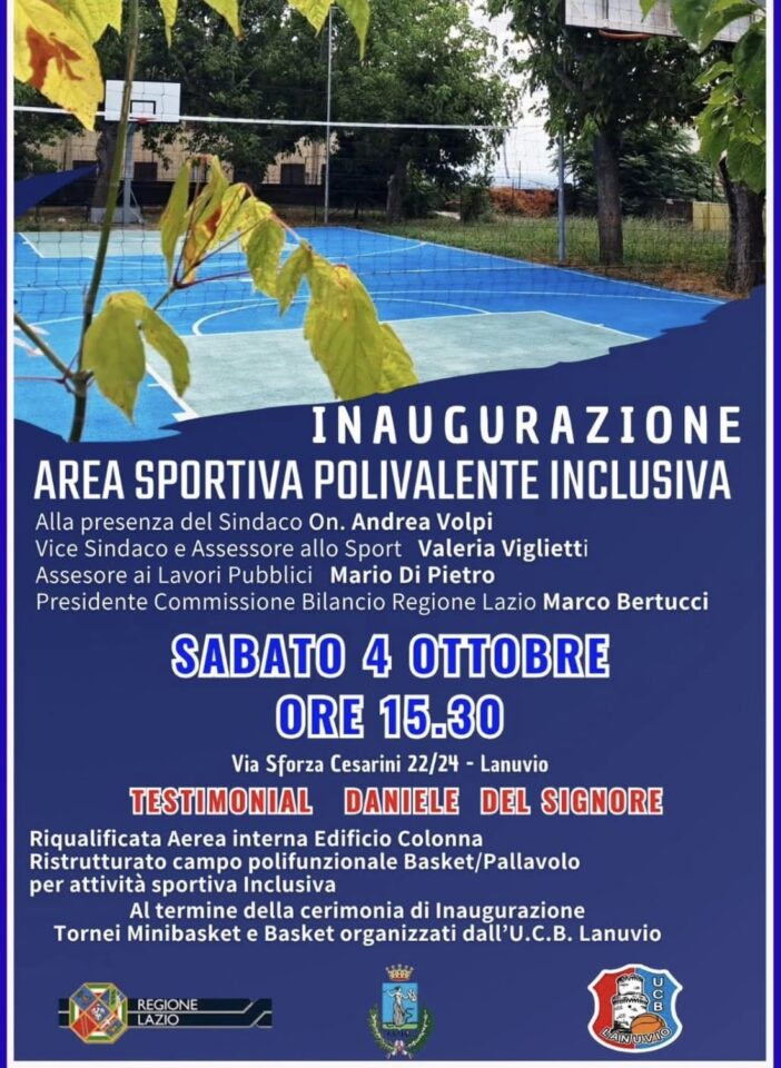 Sabato 4 ottobre, alle ore 15:30, avrà luogo a Lanuvio l’inaugurazione del nuovo campo sportivo polivalente inclusivo, realizzato nell’area riqualificata interna all’Edificio Colonna, in via Sforza Cesarini 22/24.