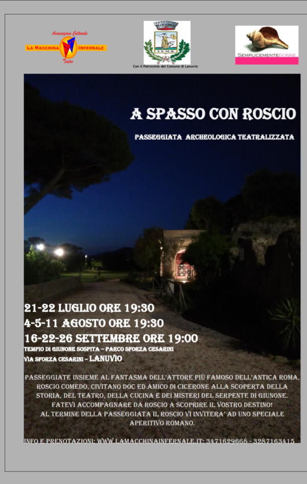 Un evento tra storia, teatro, gioco e antiche ricette: portate i vostri bambini a passeggiare col fantasma dell’attore più famoso dell’Antica Roma, Roscio Comedo, civitano DOC ed amico di Cicerone, alla scoperta della storia, del teatro, della cucina e dei misteri del serpente di Giunone.