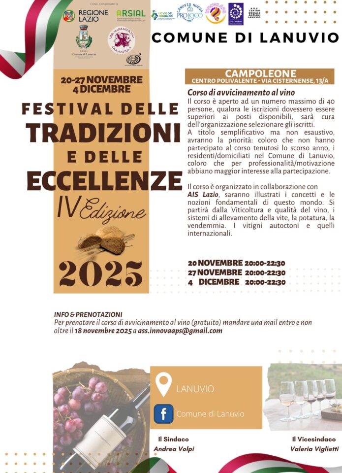 Fervono i preparativi a Lanuvio per la IV Edizione del Festival delle Tradizioni e delle Eccellenze, dedicato alla valorizzazione dei prodotti enogastronomici locali. Il Festival si svolgerà tra novembre e dicembre 2025, con appuntamenti a Lanuvio e a Campoleone.