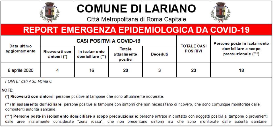 Il sindaco Maurizio Caliciotti aggiorna sul Coronavirus a Lariano. L’ultimo dato è quello di mercoledì 8 Aprile 2020: