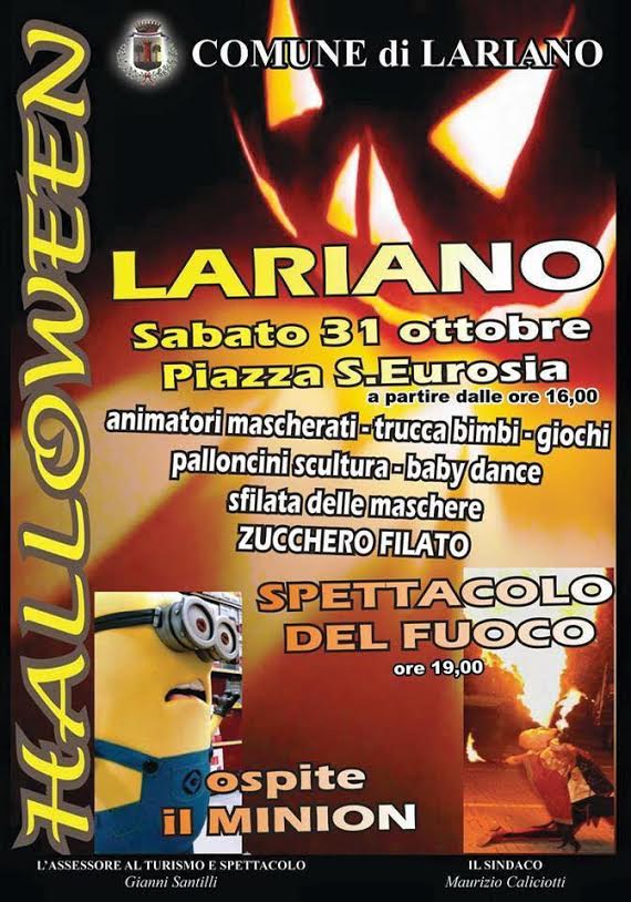 Sabato 31 Ottobre, in occasione della festa di Halloween, l’amministrazione comunale di Lariano ha organizzato nella centrale Piazza Santa Eurosia una giornata di festa. Il programma dei festeggiamenti, allestito dall’assessorato al turismo e spettacolo guidato da Gianni Santilli, prenderà il via alle ore 16 con tante attrattive come la postazione trucca bimbi, palloncini scultura, baby dance e i carretti dei pop corn e dello zucchero filato. Alle 19 poi è in programma il suggestivo spettacolo di un’artista mangiafuoco. Per la gioia dei più piccoli ci sarà, come ospite d’onore, Bob dei Minions. L’amministrazione comunale di Lariano invita tutti a partecipare al pomeriggio di festa.