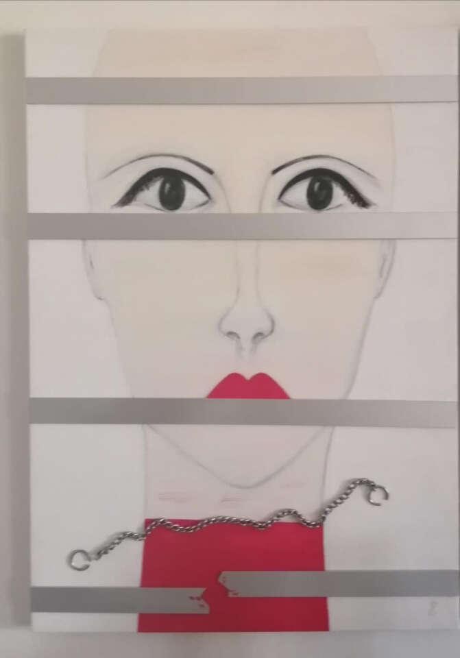 Un volto di donna in primo piano disegnato su una tela bianca. Da una parte sbarre di alluminio a serrare la bocca della donna e dall’altra catene spezzate poste sul collo dipinto di rosso, a simboleggiare la violenza interrotta dal coraggio indefesso di lei, lo stesso che riempie lo sguardo dei suoi occhi scuri e fieri. “Nessuna catena potrà mai levarmi la dignità” si legge nella didascalia posta dall’autrice a spiegazione del quadro, che ne rafforza poi il significato aggiungendo “mai più schiava”.