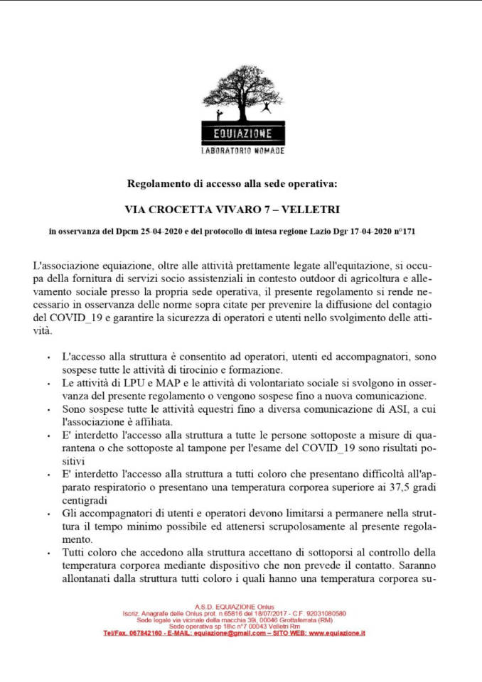 “Stiamo passando alla fase 2 della gestione della pandemia da covid -19 e nel nostro paese provato sia fisicamente che moralmente si sperimenta una rischiosa riapertura delle attività. Non si è certi della riuscita della prova e si rischia di ritornare nuovamente nella fase 1 se la curva dei contagi dovesse risalire troppo. Indubbiamente sarebbe un esperienza quasi senza ritorno per tante realtà economiche e per il morale di una società civile già duramente provata. L’associazione non è estranea a tutto questo, ci troviamo all interno del ciclone e stiamo cercando di fare la nostra parte per tenere insieme le cose più significative. Oggi più che mai crediamo che sia fondamentale sottolineare quanto sia importante la responsabilità delle proprie azioni, valore sul quale investiamo faticosamente ogni giorno; se gli uomini fossero in grado di agire per se stessi e per gli altri in egual misura, sicuramente non ci saremmo ridotti in questa raccapricciante situazione. La consapevolezza di essere soggetti della nostra vita, delle nostre scelte, la centratura per evitare risposte solamente reattive, dovrebbero essere il faro per un presente e un futuro diretti verso un’ autodeterminazione evolutiva. Forse questo può essere l’unico antidoto ad un sistema di regole che regolamentano…. affievolendo le capacità dell’individuo di autoposizionarsi nel rispetto del se e della comunità….. D’altronde è quello che ci insegnano i cavalli, e per questo cerchiamo di farli vivere in branchi sani, dove ci siano delle regole salde che aiutino il singolo e il gruppo ad andare nella stessa direzione, riconoscendo questa come un’esigenza vitale per tutti. Crediamo poi che oltre la drammatica contingenza che ci obbliga ad avere una quotidianità sempre meno rappresentativa di noi stessi, siamo anche all interno di una grande possibilità, quantomeno di comprensione…. questo paradosso è un’opportunità… non risolutiva a livello di vita “economicamente” intesa, ma più aumenta la scomodità dell’incedere più posso ascoltare la fatica, e nella fatica disegnare la forma di me….un confine, una zona di prossimità, che paradossalmente mi aiuta nella definizione e nella conoscenza. E se mi conosco, non ho paura (se non quella biologicamente sana) ne ansia, ma posso avere “esperienze” di me e ancor di più, “condivisione di me” nell’ incontro con l altro. La nostra associazione è un luogo complesso a livello relazionale, perchè cerca sempre e comunque di includere le diversità, con la difficoltà e l’imprecisione che ogni azione difficile porta con se. La differenza spaventa, ci porta ad avere reazioni di in e out group, di fuga e devianza perchè di questo siamo culturalmente figli…..non dell “opportunità del contagio” (mai cosa potesse essere simbolicamente piu azzeccata) ne tantomeno della responsabilità del contagio…… Siamo una realtà eterogenea per idee, competenze, possibilità e capacità, e continuiamo incessantemente a credere che creare luoghi in cui si possa riscoprire la radice dell umanità passando dal simbolico rapporto con l animalità sia una strada buona per rimettere le cose in cerchio. Una reciprocità che possa muovere equilibrio di spirito nella sperimentazione del se. Per questo oltre all’avvicinarsi il più possibile alle regole biologiche del comportamento morale, non abbiamo paura a confrontarci col mondo delle norme che fuori dal cerchio cerca di organizzare un popolo impazzito di paure e disorganizzazione (noi compresi…). Troverete allegate le norme di comportamento che le realtà come la nostra devono avere in questa nuova fase. Siamo convinti che saranno solamente momentanee e che all interno di questa distanza fisica ci sarà lo spazio per la costruzione di una nuova vicinanza emotiva e di spirito. Purtroppo al momento dobbiamo rimanere chiusi al pubblico come previsto a livello nazionale per i circoli sportivi, ma continuiamo a garantire una finestra oraria dalle 10 alle 12 tutti i giorni per chi volesse venire a monitorare lo stato di salute dei propri cavalli, somministrare terapie o medicinali.  Per tutto ciò che riguarda l’accudimento, l’associazione riesce a provvedere in autonomia a tutto le incombenze necessarie. Vi preghiamo di avvisare Paolo e Adele prima di passare perchè il cancello rimarrà chiuso con il lucchetto. Facciamo parte dell ASI che ,come gli altri enti di settore, sta portando le nostre vigorose rimostranze sui tavoli del governo….a breve la situazione si sbloccherà e con responsabilità potremo tornare ad animare il nostro villaggio. Nel frattempo come previsto possiamo riaprire alle attività di agricoltura e allevamento sociale (che non prevedono il salire a cavallo) nel rispetto del regolamento che alleghiamo e che dovrà essere osservato anche da tutti coloro i quali si trovino a passare in sede. Buon primo maggio a tutti, e che questo giorno così importante, fatto da lotte sacrifici e conquiste possa essere uno stimolo a resistere oggi, domani e sempre”. Lo rende noto l’Asd veliterna Equiazione