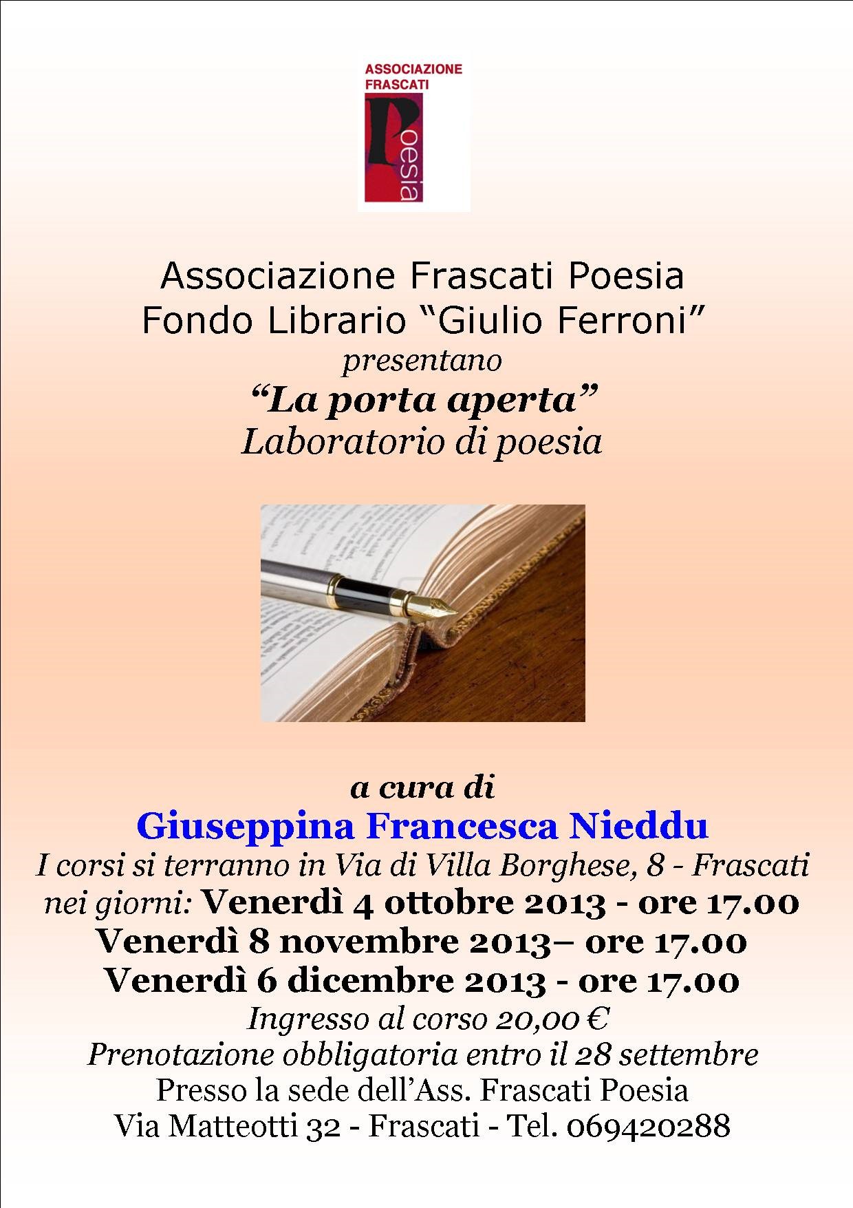La Porta Aperta: questi il titolo del laboratorio di poesia organizzato dall’Associazione Frascati Poesia in collaborazione con la docente Giuseppina Francesca Nieddu e sua cura, presso il Fondo Librario “Giulio Ferroni” (Via di Villa Borghese, 8 – 00044 Frascati). Il laboratorio è rivolto agli adulti. Tre gli appuntamenti per il 2013, a partire dalle ore 17.00: