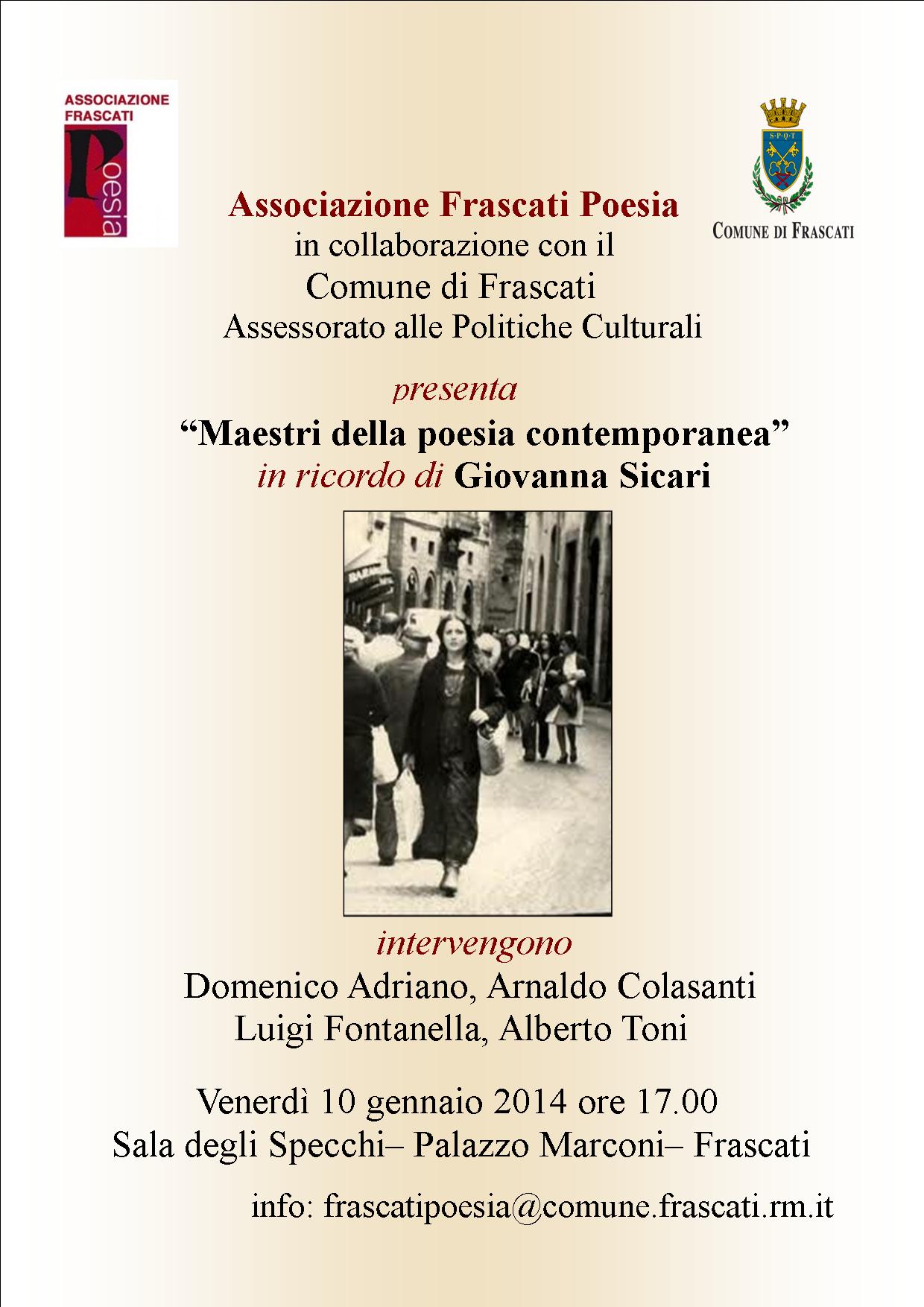 Si svolge venerdì 10 gennaio 2014 il primo appuntamento delle attività dell’Associazione Frascati Poesia dal titolo “Maestri della Poesia Contemporanea, in ricordo di Giovanna Sicari”. Intervengono Domenico Adriano, Arnaldo Colasanti, Luigi Fontanella, Alberto Toni, etc. Poetessa e scrittrice, Giovanna Sicari è stata la moglie del poeta Milo De Angelis. Nata a Taranto nel 1954, si è spenta a Roma nel 2003. Voce forte ed intensa secondo novecento letterario e poetico italiano, la Sicari si è affermata con liriche e scritti di alto pregio. La raccolta di poesie di Milo De Angelis Tema dell’addio è a lei dedicata. Venerdì 18 gennaio 2014 si svolge una manifestazione dedicata ad Elio Matassi, dal titolo “Ritratto di un filosofo”. Figura di spicco nel panorama culturale italiano, Matassi è scomparso prematuramente nell’ottobre dello scorso anno. La sua opera sterminata resta una pietra miliare nel mondo filosofico nazionale ed internazionale. Coordina l’evento Arnaldo Colasanti. Gli appuntamenti si svolgeranno in collaborazione con il Comune di Frascati, Assessorato alle Politiche Culturali, a partire dalle ore 17.00 presso la Sala degli Specchi di Palazzo Marconi. Per maggiori informazioni, Associazione Frascati Poesia, tel. 06.94184575; 06.9420288 www.frascatipoesia.it email: frascatipoesia@comune.frascati.rm.it.