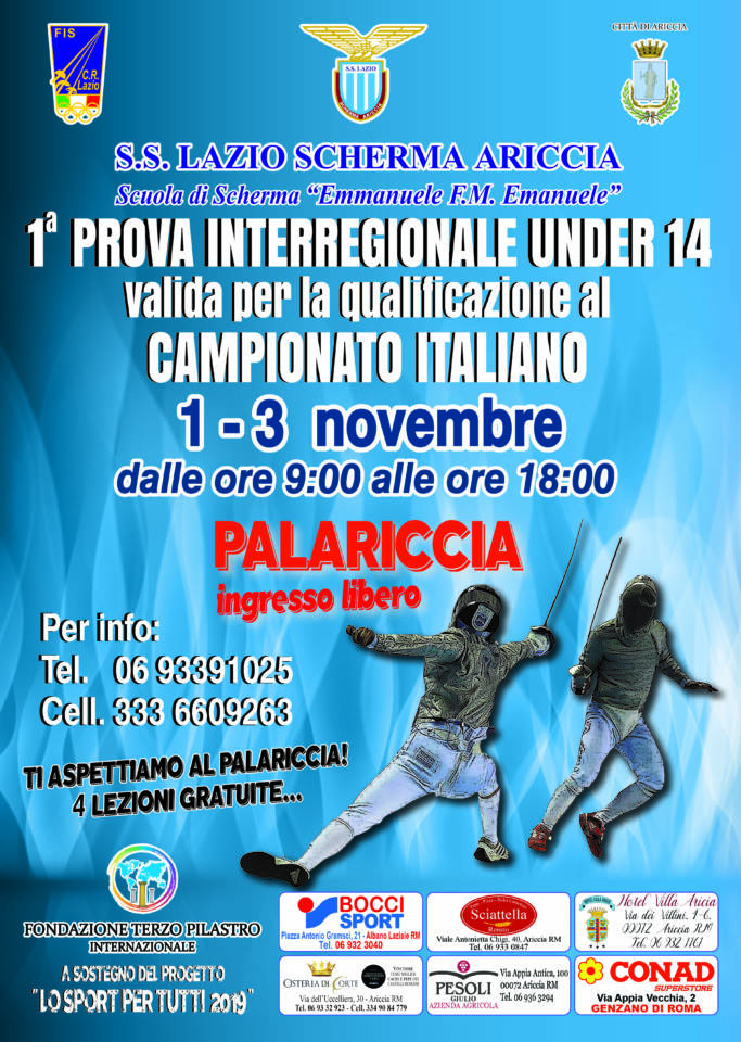 Finesettimana intenso al Palariccia di Ariccia: oltre 1000 under 14 si affronteranno sulle pedane nella 1^ prova interregionale valida per la qualificazione Campionato Italiano di categoria. La manifestazione, organizzata dalla Lazio Scherma Ariccia per il Comitato Regionale FIS Lazio, si svolgerà da venerdì primo a domenica 3 novembre e vedrà schierati i migliori giovani atleti del Lazio, Campania, Abruzzo, Marche ed Umbria nelle tre armi: fioretto, spada e sciabola. Le premiazioni inizieranno presumibilmente alle ore 15.00, l’ingresso è libero.