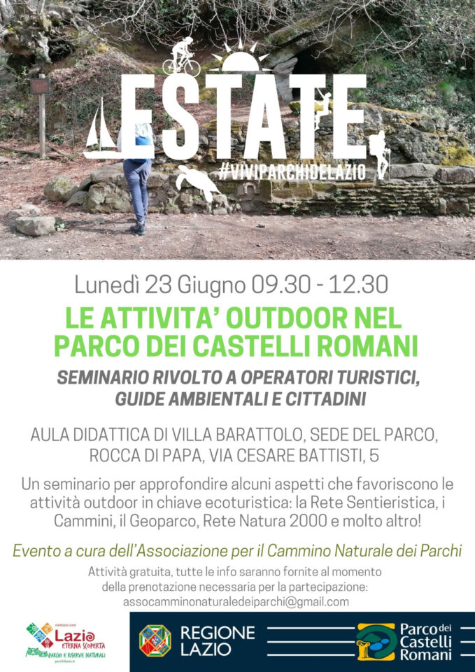 Un seminario gratuito per imparare a raccontare il territorio. Si svolgerà lunedì 23 giugno dalle ore 9.30 alle 12.30 presso l’Aula didattica di ‘Villa Barattolo’, sede del Parco dei Castelli Romani – via Cesare Battisti, 5 a Rocca di Papa (RM), l’incontro rivolto a operatori turistici, guide ambientali e cittadini, dal titolo “Le attività outdoor nel Parco dei Castelli Romani”, a cura dell’Associazione per il Cammino Naturale dei Parchi.
