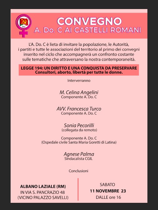 “L’A. Do. C. – Assemblea Donne Comuniste – è lieta di invitare la popolazione, le Autorità, i partiti e tutte le associazioni del territorio al primo dei convegni inserito nel ciclo che accompagnerà un confronto costante sulle tematiche che attraversano la nostra contemporaneità.