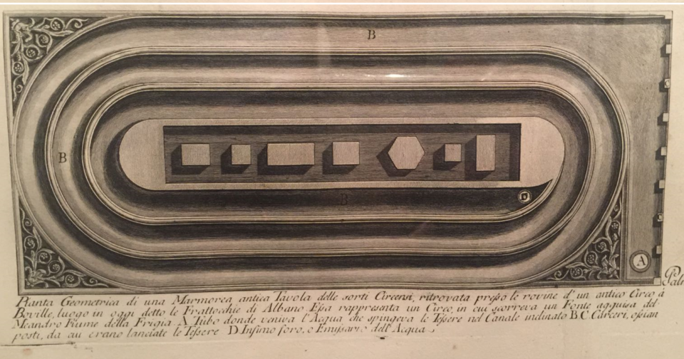 Il Circo di Bovillae, un antico circo romano, conosciuto in tutto il mondo per i resti dei cosiddetti “carceres”,una sorta di box di partenza per le corse con i carri, è tornato recentemente alla ribalta soprattutto per due episodi che ne hanno fatto notizia di cronaca. Quello più recente in relazione al processo per un abuso edilizio proprio nei pressi degli archi dello stesso circo. L’altro per un ritrovamento casuale di un particolare sarcofago di piombo ancora intatto ,durante gli scavi per lavori pubblici nel comune di Marino, in via Delle Giostre, tra Due Santi e Frattocchie, di cui se ne ebbe notizia da un interessante articolo apparso sul Messaggero il 25 luglio del 2015, a firma di Laura Larcan :”L’enigma del sarcofago di piombo”. A riguardo di tale antica struttura, conosciamo come gli studi del Tambroni e del Poletti ne avevano evidenziato le dimensioni, proponendo come lunghezza oltre 300 mt. e la larghezza di circa 60 mt., con una capienza che poteva ospitare oltre 8000 spettatori seduti. Che i circhi nel passato fossero adibiti sia per i ludi scenici che per quelli circensi, per le cacce (venationes) o per le lotte gladiatorie è ben risaputo. A proposito invece dell’immagine riprodotta dal Piranesi (1778) del modellino in pietra ritrovato a Bovillae ,nel luogo detto Frattocchie, molto probabilmente alla fine del Settecento, rimane dubbioso pensare ad un gioco come “il lancio delle tessere” come asserisce lo stesso autore nelle note a margine, come una sorta di pallottoliere per il sorteggio delle postazioni dei carri durante le corse. Dall’attenta osservazione verrebbe in mente un meccanismo idraulico molto più complesso e congegnato tale da poter apportare un grande quantitativo di acqua in poco tempo regolandone in un certo modo la pressione con un percorso a serpentina, quale appare nella superba incisione. Si potrebbe così interpretare tale artificio come un impressionante effetto scenografico come quello dell’allagamento dell’arena in poco tempo per poter svolgere la “Naumachia”, una vera e propria battaglia navale ,che veniva inscenata a ricordo di vittorie storiche dei combattimenti avvenuti sul mare. Potremmo dunque pensare ad un condotto che conduce l’acqua con la pendenza che inizia dai Carceres , e che si snoda in un percorso probabilmente sotterraneo , sino ad arrivare a quel “foro infimo” (D) che costituiva un elemento fondamentale dalla cui chiusura veniva regolato il riempimento per l’allagamento dell’arena sovrastante o usato come un enorme cisternone. Questa struttura particolarmente adatta per spettacoli del genere soprattutto per la sacralità dei riti e del luogo aveva una ragion d’essere grazie alla possibilità di avere a disposizione l’acqua di un antico acquedotto ancora tutto da studiare, che ne lambisce la struttura stessa del circo e dove sono ben documentati gli effetti delle concrezioni calcaree legati al continuo riempimento e svuotamento dei lumina (pozzetti d’ispezione). Del modellino in marmo rinvenuto negli scavi presso il Circo come descritto dal Piranesi se ne erano perse le tracce e solo recentemente nel 2012 è stato ritrovato durante i restauri dell’Ercole giacente dei Musei Vaticani a cura di un’equipe di esperti guidati dalla Prof.ssa Claudia Valeri che dopo un attento studio ne ha evidenziato il riutilizzo come sostegno e parte della statua stessa.
