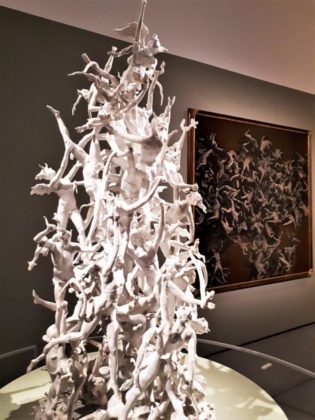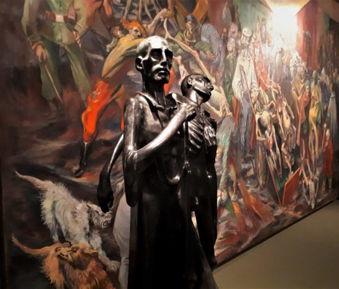 Questa rassegna, perciò, è anche un cammino simbolico, che, dalla “selva oscura” dell’ingresso (e attraverso la scala a chiocciola) porta in sù, verso la redenzione. E lo fa attraverso un’impressionante sequenza di capolavori (frutto di un grande sforzo intellettuale e produttivo) che vanno dalla copia in gesso della monumentale “Porta dell’Inferno” di Auguste Rodin (modello di fusione in scala 1:1, alto 7 metri) all’inizio del percorso (vertice delle riflessioni artistiche di tutti i tempi sul poema di Dante) al “Giudizio Finale” di Beato Angelico, da “Le tentazioni di Sant’Antonio” di Brueghel, fino al teatrino napoletano con i pupi, da Piranesi, a Delacroix, da Dix a Balla (peccato solo per la “Voragine infernale” di Botticelli, eccezionalmente in prestito dalla Biblioteca Apostolica Vaticana solo per le prime due settimane).