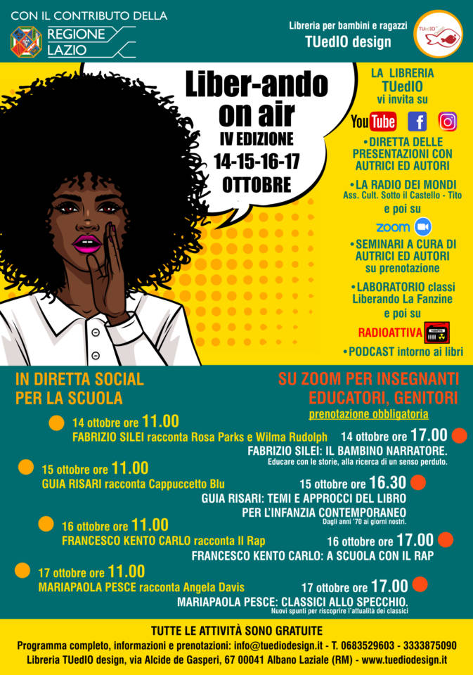 La libreria indipendente TUedIO design apre il proprio “anno scolastico” dal 14 al 17 Ottobre con il festival letterario on line di quattro giorni Liberando on air, grazie al contributo della Regione Lazio, approfittando del momento di incertezza, per approfondire, sperimentare e includere il più possibile. Liberando on air è la quarta edizione di un progetto che la libreria porta avanti da diversi anni e risponde all’esigenza di riflettere e rileggere criticamente i libri di testo, di intervenire decostruendo gli stereotipi che essi ancora veicolano e di proporre storie di donne e persone lontane dalla comunità dominante, che vengono taciute o mal rappresentate. Raccogliendo e raccontando storie universali, però, in questa nuova veste “on air”, TUedIO design ha come obiettivo, oltre quello di coinvolgere ragazzi e ragazze e bambini e bambine e docenti della scuola primaria e secondaria di primo grado, quello di ampliare le proprie potenzialità e raggiungere, grazie alla programmazione online, un numero e una varietà maggiore di persone, soprattutto chi ha più difficoltà ad uscire di casa. Liberando on air sarà dedicato all’incontro con quattro autori con la presentazione dei loro libri e quattro seminari di approfondimento, un laboratorio di scrittura collettiva per ragazzi e ragazze e una raccolta di podcast La Radio dei mondi, che racconterà in modo insolito il contesto abitato da protagonisti e protagoniste dei libri. Tutte le attività del Festival sono gratuite, per i seminari e il laboratorio è obbligatoria la prenotazione. “Quando abbiamo letto l’avviso della Regione Lazio, che puntava sulla promozione alla lettura con eventi da svolgersi esclusivamente on line abbiamo un po’ tremato, ma a fine maggio da poco usciti tutti dal lockdown, era comprensibile una simile richiesta. L’idea del progetto è venuta immediatamente: facciamo la IV edizione di Liberando. Per due motivi: proseguire un lavoro già avviato e a cui io, Marina, tengo tantissimo e il secondo è perché il festival da sempre dedicato alle scuole e a chi gira intorno al mondo della formazione è perfetto sia per scuole, alunni, alunne e docenti, che hanno pagato un caro prezzo durante la chiusura e quindi dedicare progettualità, spazio, emozioni a loro era la cosa che più sentiamo giusta. Un piccolo bellissimo risarcimento”. Lo dichiara la libraia Marina Checchi, presentando Liberando on air.