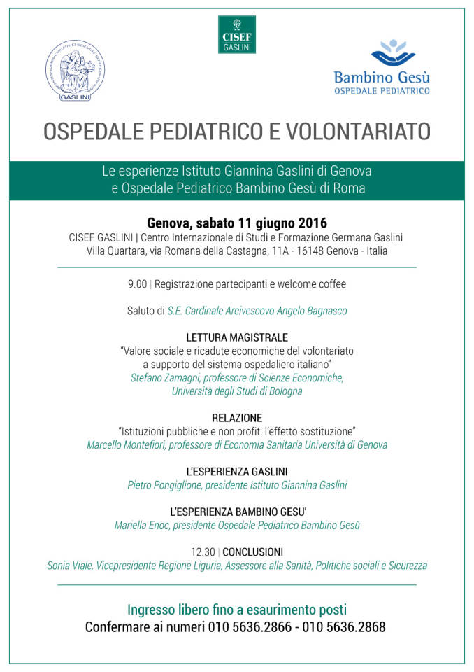 locandina programma Convegno Ospedale Pediatrico e Volontariato 11.06.16Il valore sociale e le ricadute economiche del volontariato a supporto del complesso e delicato mondo ospedaliero, ancora più indispensabile quando si tratta di prestare aiuto, ascolto e conforto nell’ambito di ospedali pediatrici internazionali, a servizio di bambini malati provenienti da moltissimi Paesi del mondo, spesso portatori di bisogni che vanno ben oltre l’erogazione di una prestazione sanitaria. Sarà questo il tema più che mai attuale e strategico del Convegno “Ospedale Pediatrico e Volontariato” che si terrà sabato 11 giugno 2016 dalle ore 9.00 alle 13.00 presso il Centro Internazionale di Studi e Formazione CISEF Gaslini di Genova, organizzato dall’Istituto Giannina Gaslini insieme all’Ospedale Bambino Gesù di Roma.