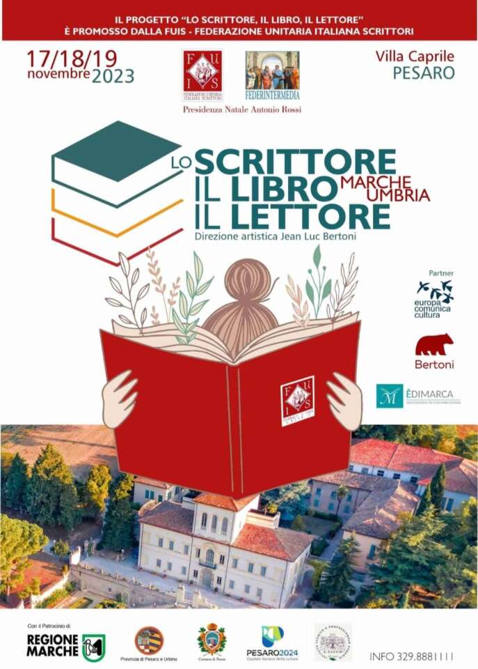 PESARO, 15 novembre 2023 – Al via il 17 novembre 2023 a Pesaro il primo dei due appuntamenti dell’evento “LO SCRITTORE, IL LIBRO, IL LETTORE”, il primo Festival letterario che vede protagonista lo scrittore, promosso da Federazione Unitaria Italiana Scrittori e Federintermedia, in collaborazione con l’Associazione Europa Comunica Cultura; Bertoni editore e l’Associazione editori marchigiani ÈdiMarca, con il patrocinio di Regione Marche; Provincia di Pesaro e Urbino; Comune di Pesaro e l’Istituto Tecnico e Professionale Agrario “A. Cecchi”.