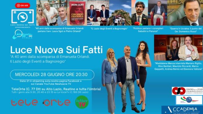 Scatta la 23° puntata della terza edizione di “Luce Nuova sui fatti”, la trasmissione di approfondimento tematico settimanale ideata e condotta dal giornalista viterbese Gaetano Alaimo. Mercoledì 28 giugno alle 20.30 su TeleOrte (C. 77 Dtt visibile su tutta l’Umbria, Alto Lazio e provincia di Rieti) con repliche settimanali su Tro e Tro2 e, ogni giorno, su La Voce Tv (C.188 Dtt Lazio) con programmazione alle 9.30, 20.40 e 23.15, ed in streaming sulla pagina di Luce Nuova sui fatti di facebook e sul circuito LSFN sarà in onda il format settimanale più seguito dell’Alto Lazio e tra i più seguiti del Centro Italia.