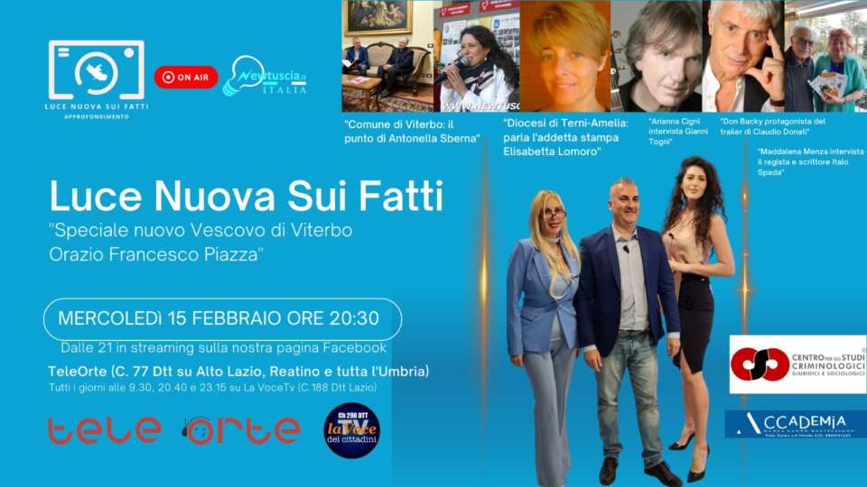 Questa puntata sarà dedicata al focus sul nuovo Vescovo di Viterbo Orazio Francesco Piazza, insediatosi lo scorso 3 dicembre, docente per oltre 40 anni, giornalista televisivo e già Vescovo di Sessa Aurunca. Verrà trattata anche la Giornata della stampa voluta da Monsignor Piazza e svoltasi al Centro di documentazione diocesana di Viterbo.