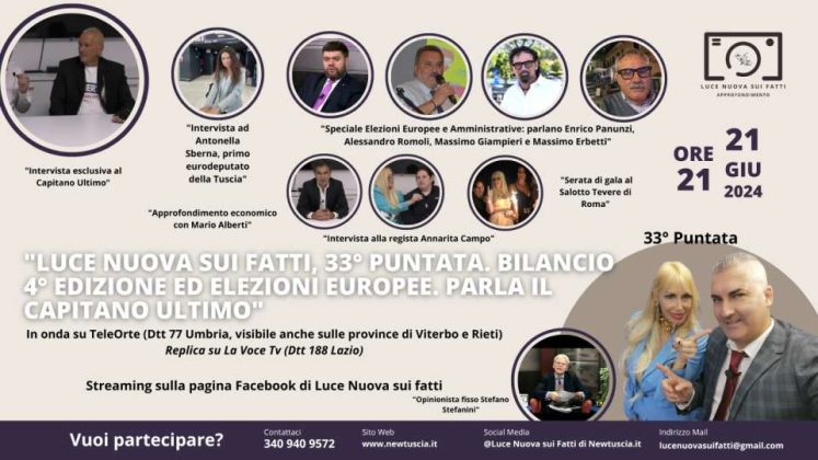 Scatta la trentatreesima puntata ufficiale e ultima della quarta edizione di “Luce Nuova sui fatti”. Giovedì 20 giugno alle 21, su TeleOrte (Dtt 77 Umbria, visibile anche nelle province di Viterbo e Rieti) e venerdì 21 giugno alle 21 sulla pagina https://www.facebook.com/lucenuovasuifatti?locale=it_IT e sul circuito LNSF